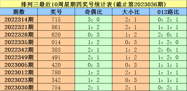 胪列三第2023030期(上周星期四)奖号为754。其中奖号奇偶比为2:1,大小比为2:1,012路比为0:2:1。
