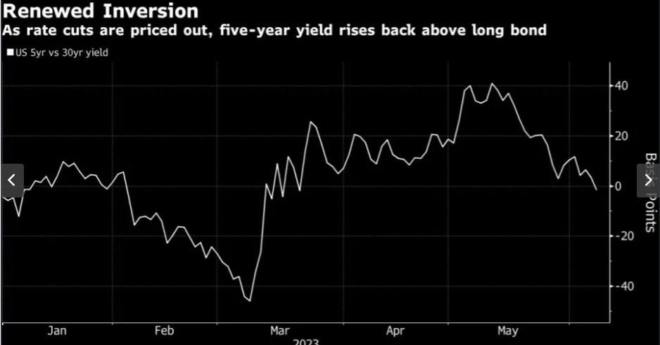 与此同期,好意思国国债收益率弧线交投活跃,因30年期好意思债的卖压不足5年期好意思债,激励收益率弧线再度倒挂。5年期好意思债收益率一度飞腾至较遥远好意思债逾越近3个基点的水平,为3月22日以来最大的倒挂,但纽约尾盘收窄。在5月初,阛阓预期本年晚些时刻降息,这部分好意思债收益率弧线笔陡进度达到峰值;但随后的趋翻案映出做事数据趋稳、通胀压力执续,以及阛阓对宽松计策的消化。