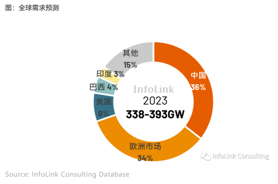 Infolink Consulting算计,2023年全年光伏需求约在338-398GW,中国、欧洲的需求量络续位列前二。