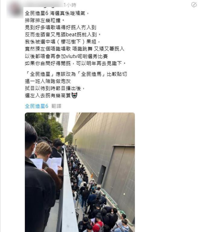 确认有份报名的香港网友在酬酢网站发布的相片, 《全民造星6》海选场面外从上昼起便大排长龙,保守推测有上千东谈主,而他哀叹不知谈还要等多久,其他网友则留言称,按照往年的情况,即便瞻望中午口试,也可能要列队至更阑才能入场。而这一定过程上反应出姜涛、卢瀚霆的成效对当地年青东谈主的影响,他们荒谬渴慕成为顶流。